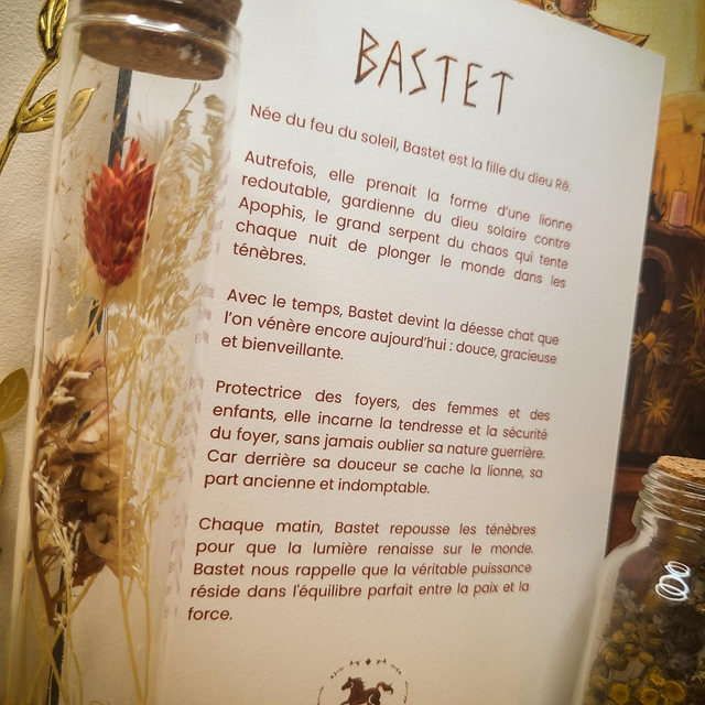 Bastet, déesse égyptienne du foyer, de la douceur et de la protection, incarne l’harmonie entre force et bienveillance. Jadis représentée sous forme de lionne redoutable avant de devenir la déesse-chat bienveillante, elle veille sur les foyers et éloigne le mal.