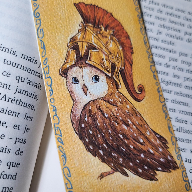 Ce marque-page met en avant la chouette, animal emblématique d’Athéna, coiffée de son casque divin. Symbole de sagesse, de stratégie et de clairvoyance, il apportera une touche mythologique à vos lectures.