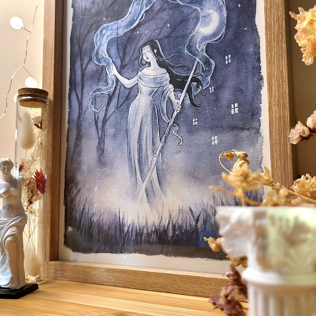 Nyx, déesse primordiale de la nuit, représente le mystère et la puissance de l’obscurité. Elle incarne les cycles du repos et du renouveau, idéale pour ceux qui recherchent une atmosphère énigmatique et apaisante dans leur intérieur.