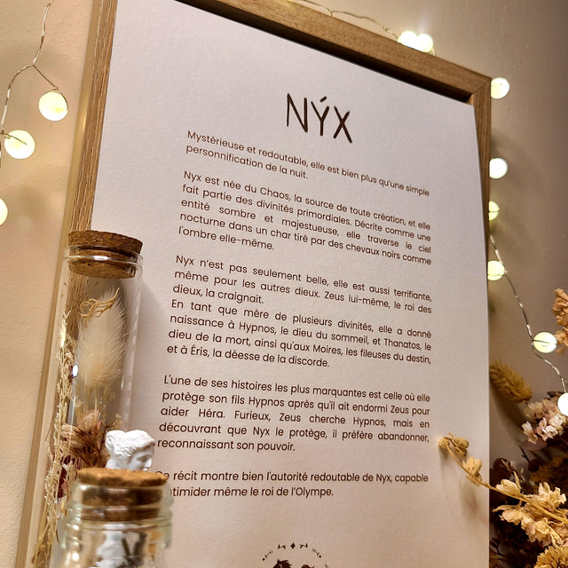 - Histoire de Nyx au dos de l’illustration.