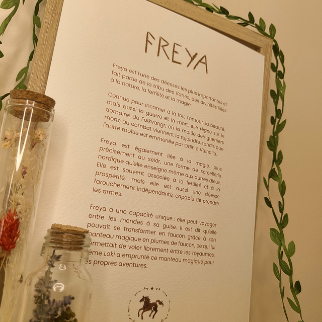 Freyja, déesse de l’amour, de la beauté et de la guerre, incarne la dualité entre passion et force. Eelle est aussi une puissante guerrière à la tête des Valkyries. Idéale pour ceux qui veulent célébrer leur pouvoir intérieur et explorer l’énergie des émotions intenses.
